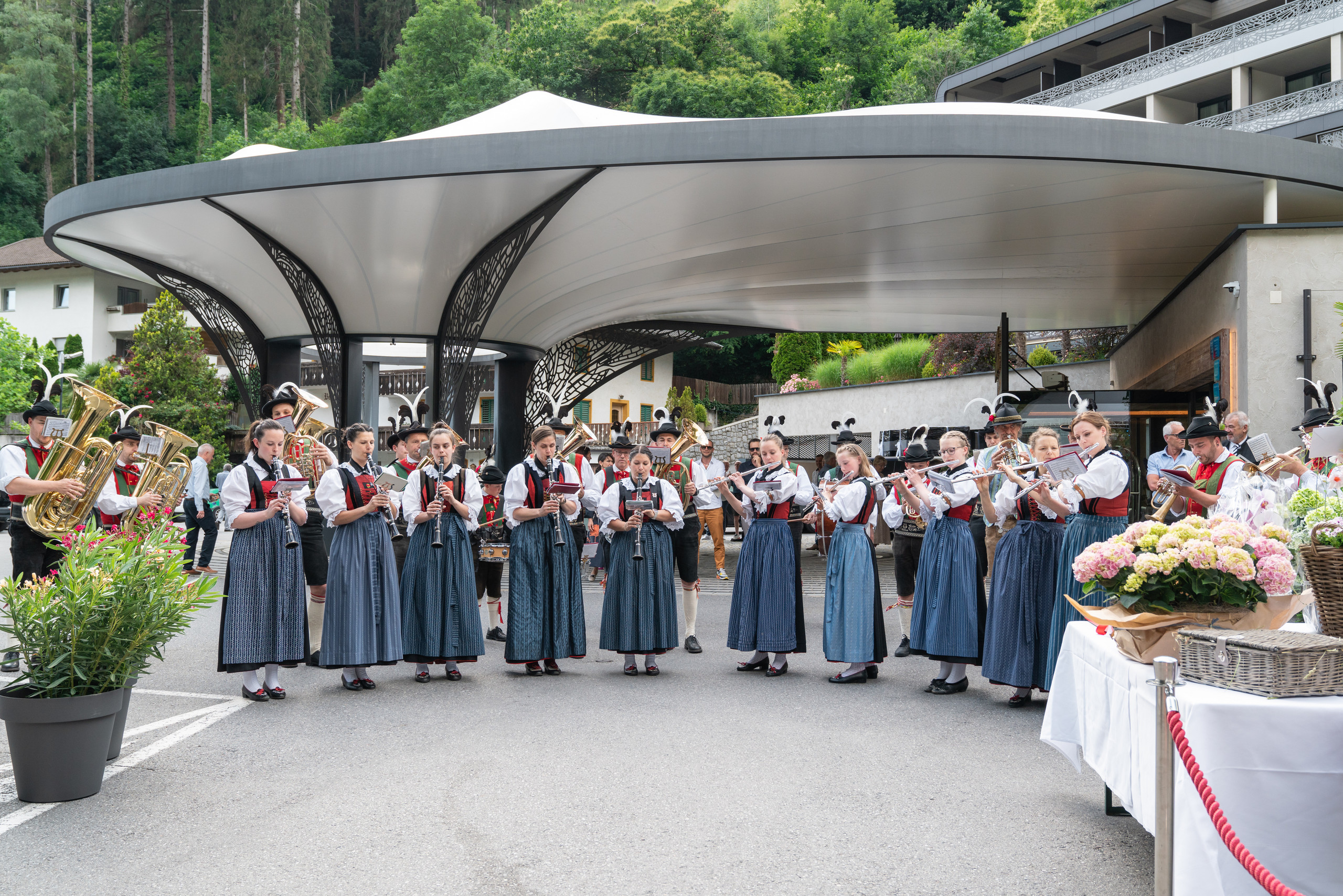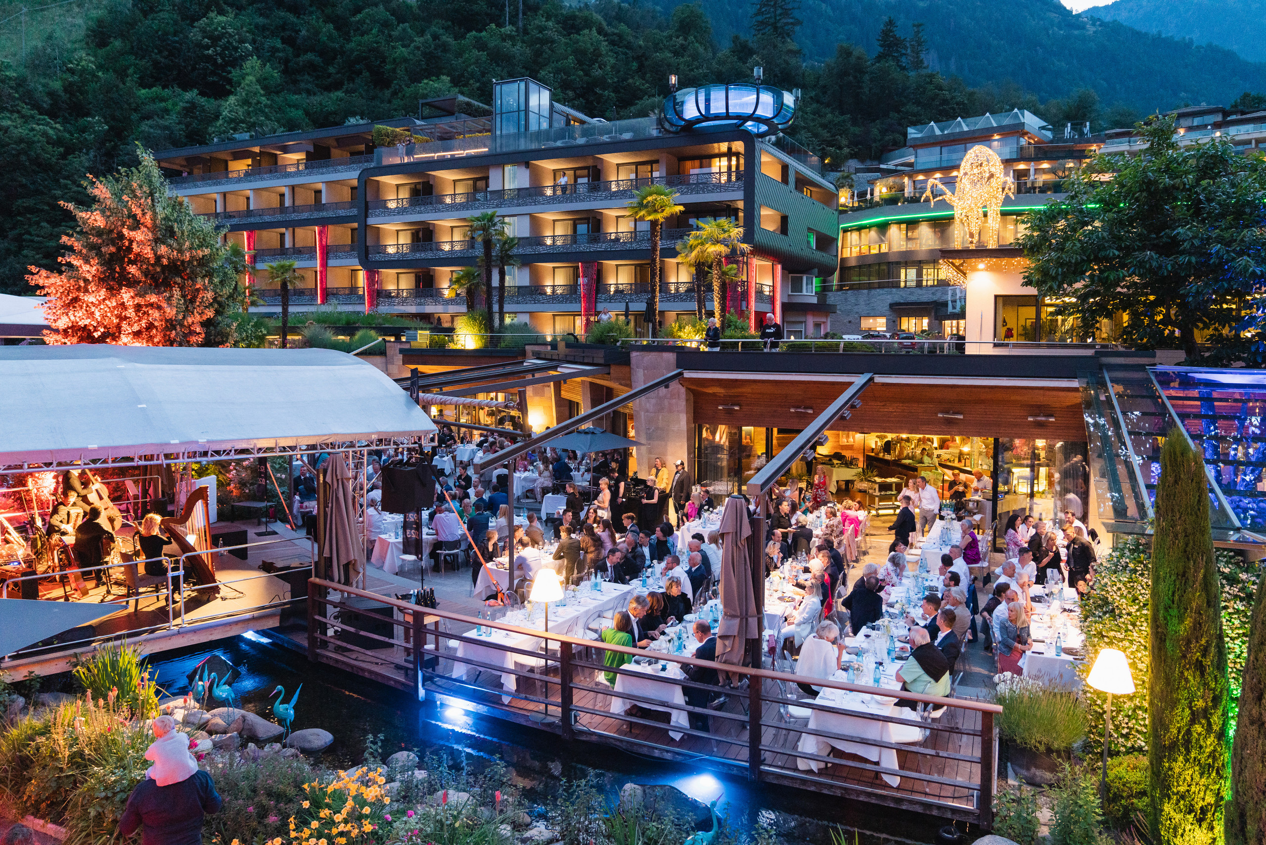 Ein meterlanger roter Teppich wurde vor dem Haupteingang entlang des idyllischen Gartens des Quellenhofs ausgerollt, um die Gäste gebührend zu empfangen. Gastgeber Heinrich Dorfer ließ es sich dabei nicht nehmen, jeden einzelnen Gast zu begrüßen und sich persönlich bei ihm zu bedanken. Bei einem leckeren Erfrischungsgetränk und exquisiten Canapés, zubereitet von Chefkoch Michael Mayr, genossen die geladenen Gäste den lauen Sommerabend, welcher durch musikalische Klänge der Künstlerin Tracy Merano umrahmt wurde.