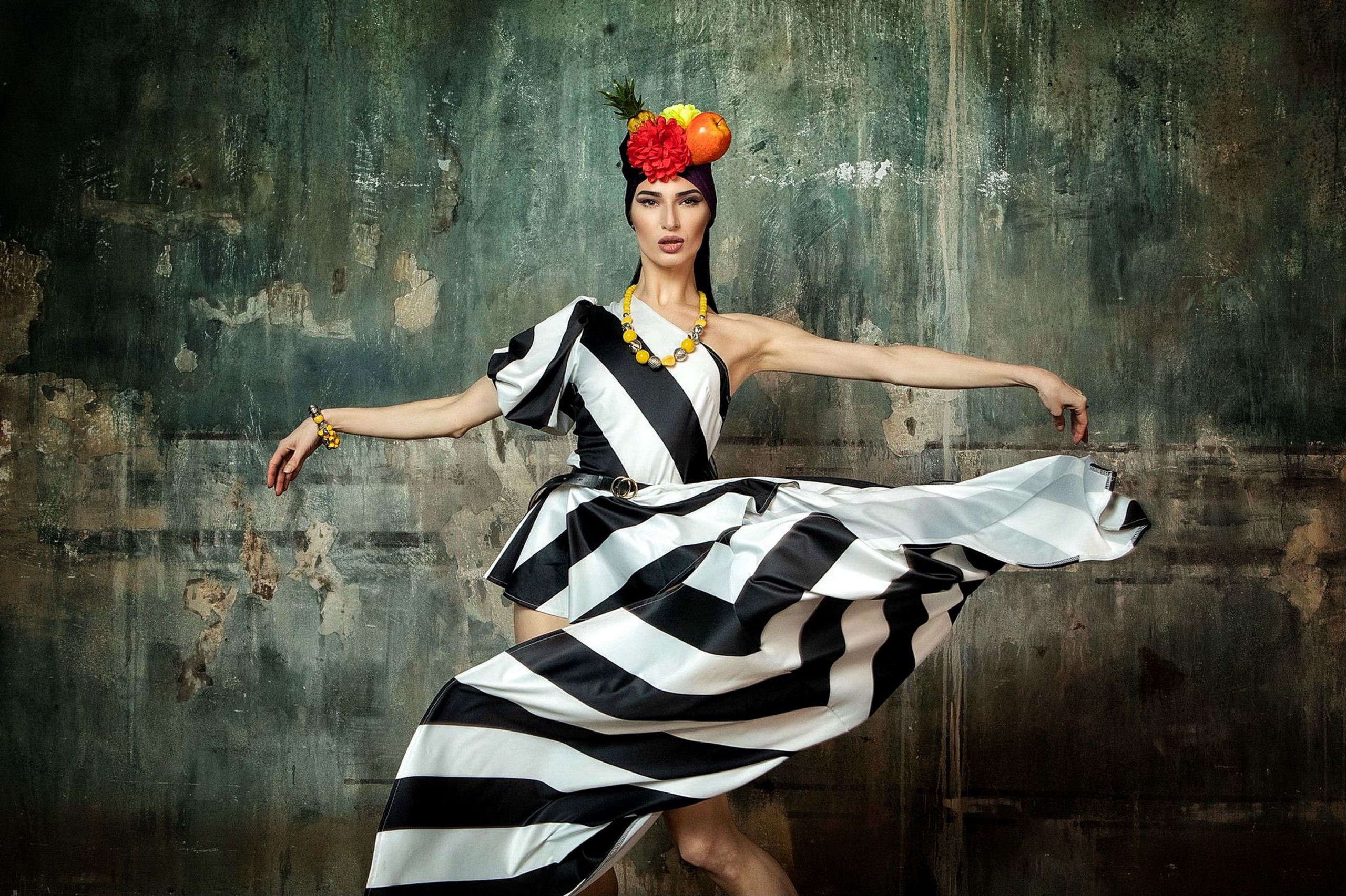 Una serata dalle tinte allegre, a volte vivaci, nelle tonalità blu e verde della costa atlantica, dove tramonta un sole arancione per dare inizio a una notte focosa.